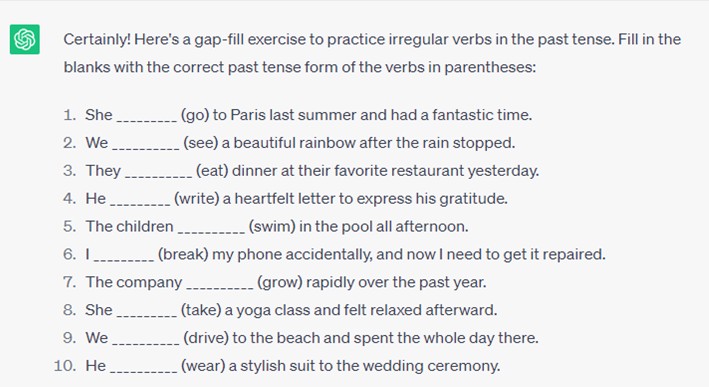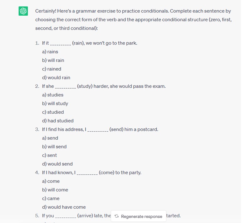 SP “ChatGPT, crea un ejercicio de gramática para practicar los condicionales / verbos irregulares en pasado / inversiones en inglés”.